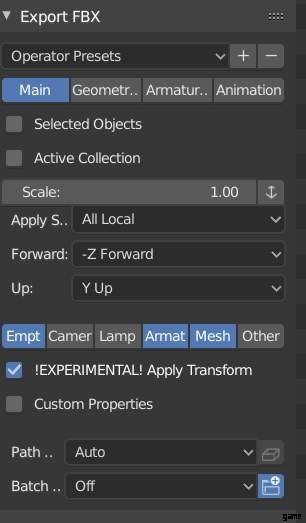 さて、準備が整ったら、ジューシーなビットをどうぞ。エクスポート設定が消えるエラーが発生しました(私かブレンダーかはわかりません)。その場合は、オブジェクト モードでエクスポートするものを選択し、Ctrl キーを押します。新しい空の .blend を開き、そこで ctrl v します。アニメーションの場合、タイムラインの長さをリセットする必要があります。