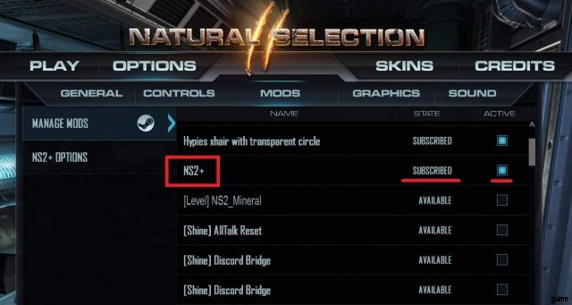 入手したら、メイン メニューの NS2 の [Mod] タブに移動します。そこにあります。「購読済み」ステータスになっているはずです。ボックスにチェックを入れて有効にします。