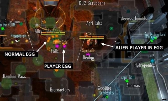 ご覧のとおり、通常の卵は NS2 の構造と見なされます。そのため、ミニマップではオレンジ色になっています。しかし、エイリアン プレイヤーが進化するために卵に戻った場合 (新しいアップグレードを取得するか、別の生命体に進化するかのいずれか)、卵の形であってもプレイヤーの色を維持します。
