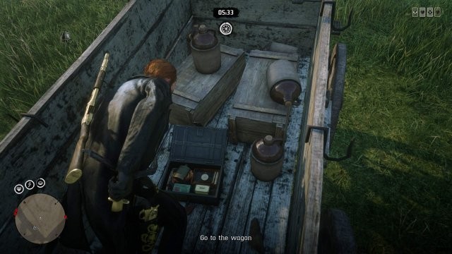 収入エージェントのワゴンを確認することを忘れないでください。ほとんどの場合、ムーンシャイン 1 個、ゴールド ウォッチ 1 個 (1 個あたり 7 ドル)、Deadeye を補充するためのチューイン ガム 1 個、およびいくつかの役に立たない弾薬が入ったロックボックスが含まれています。インベントリに密造酒が 30 個ある場合は、ロックボックス内の他のアイテムに簡単にアクセスできるように、健康を強化するために 1 個飲んでください。下のワゴンとロックボックスの画像: