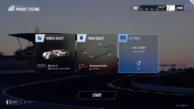 次に、正しいトラック「Nurburging Nordschleife」を選択します。 Audi R18 e-tron '14 を使用しました。(DLC カーではありません。)すべてのアシストをオンにできます。