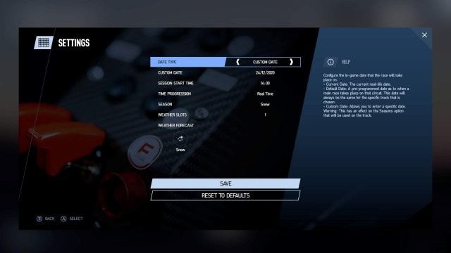 この実績を得るために使用した設定は、スクリーンショットのものです。レース トラックが雪である必要はありません。天気予報が「雪」であればよいのです。