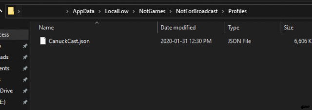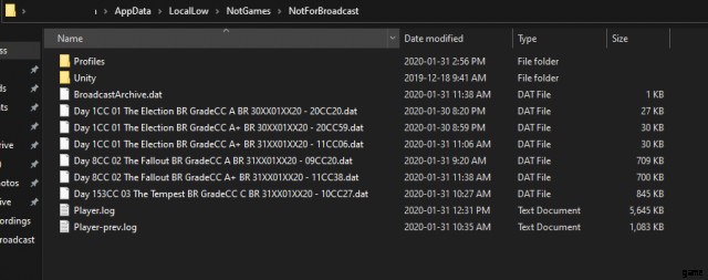 ここにリストされているファイルは、アーカイブを介して再生するために保存されたブロードキャストになります。それらは、セーブ ゲームとは別に保存されます。これらを削除して、[アーカイブ] メニューから削除できます。ここで Profiles フォルダを開くと、保存したゲームが一覧表示されます。