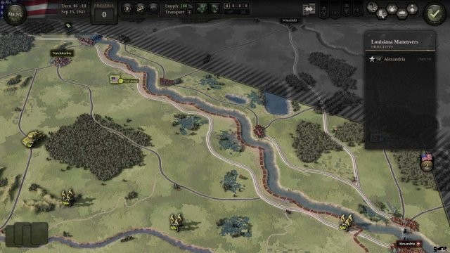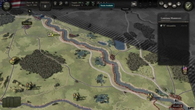 それでは、私たちが知っていることから始めましょう。画面 1 では、1941 年のルイジアナ作戦中に、3 つのアメリカ歩兵ユニットと 1 つのアメリカ機甲ユニットが見えます。ユニットはアレクサンドリア (右下) で目的を達成しようとしていますが、この説明の目的のために、次の数ターンの間、それらを所定の位置にとどめます。