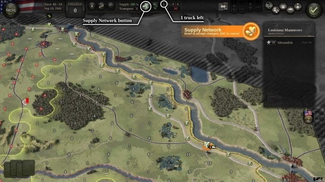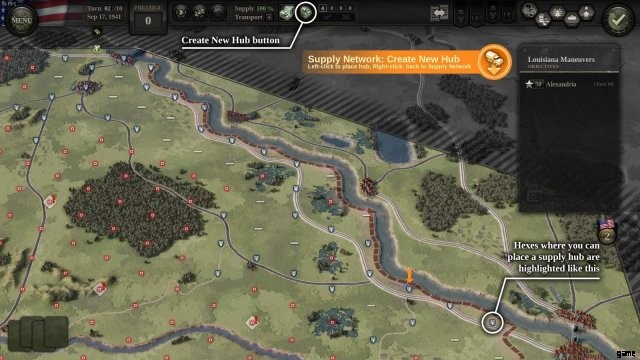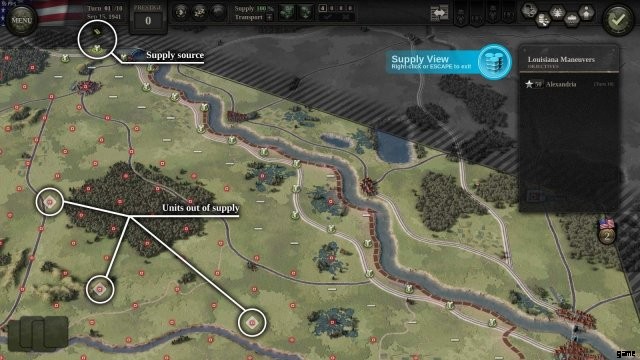 ユニットは毎ターン補給する必要があります。さもなければユニットは弱くなり、効果がなくなります。彼らはターンの開始時に補給を受け取りますが、補給されたヘクス(場所)にいる場合に限ります。画面 #2 (下) で、補給ビュー ボタン (ホットキー V) を押して、どのヘクスに補給があり、どのヘクスが補給されていないかを確認します。