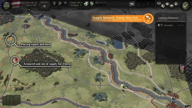 - Supply Disruption: notice how some of the in-supply bars in screen #9 have a little red in them? Placing a supply hub on road (as opposed to rail) introduces some uncertainty as to whether your unit will actually receive supply when the turn starts. Other things introduce disruption too:mud, snow, ruined cities, stragglers, etc.