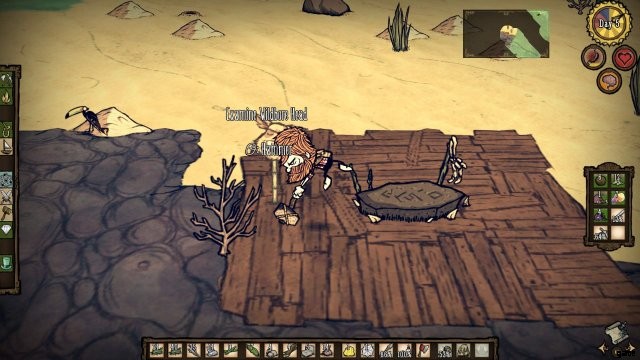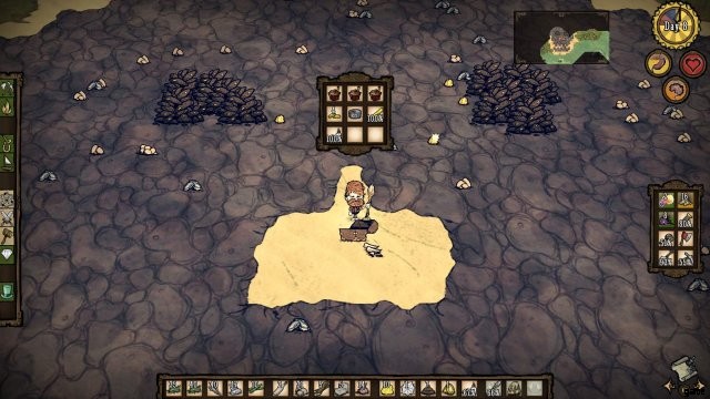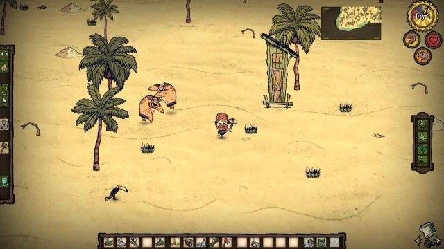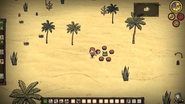 私が始めた最初の瞬間はかなり標準的でした。草、小枝、フリント、その他のグッズを集めました (貝殻は別として)。ウッディの能力は既に使われている。在庫スペースは重要なので、これを補うために手のひらのバックパックを手に入れることができます.他の人は斧を作るために貴重な火打ち石を使う必要がありますが、ウッディは最初からヤシの葉を手に入れることができます.この便利なバックパックを集めるために貴重な時間とフリントを無駄にする心配はもうありません。