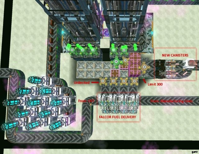 FALCOR 入力は、ランダムな場所からのキャニスターの配送を受け入れます。 FALCOR を燃料の供給/返却に使用する目的は、燃料ラインを短くすることです。たとえば、基地から 100 m 離れた場所にあるハイブ マインド ファームでは、この場所に燃料を運ぶために、少なくともその数のコンベヤが必要です。そんなに多くの燃料を置いておく必要はありません。そのため、FALCOR はロジスティック ホッパーを、すべてを稼働させ続けるのに十分な燃料で満たすことができます。