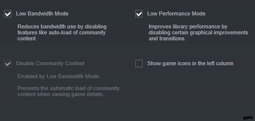 低帯域幅モードを有効にすると、サーバーからのデータ ストリームの負荷が大幅に減少し、コミュニティ コンテンツの自動読み込みも無効になります。これも有効にすることをお勧めします。