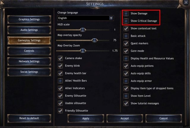Show Damage と Show Critical Damage 設定のチェックを外します。