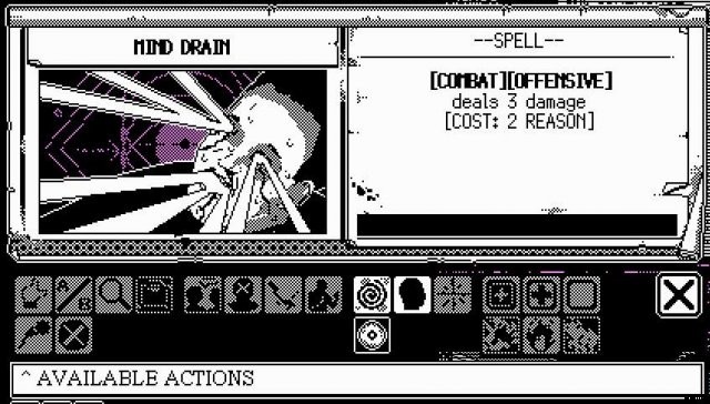 これらは通常、スタミナ、理由、またはその両方を必要としますが、破滅を招くこともあります。呪文は、医療ボタンの左側にある一連のボタンを使用して、時間コストなしで即座に効果を発揮します。調査用のユーティリティ スペルと戦闘スペルがあります。