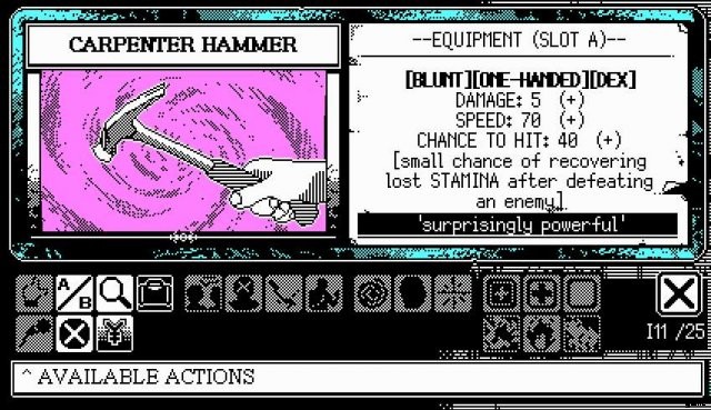 アイテムと同様に、これらは左端のボタン セットを使用しますが、これらはすべて装備のスロット A に装備されています。これらは戦闘中の攻撃を強化し、ダメージ、攻撃速度、命中率、そしてこの驚くべき大工ハンマーのような時折のボーナス効果を変化させます。余談ですが、速度が遅いほど良いようです。