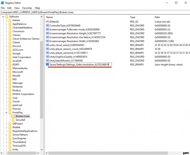 「HKEY_CURRENT_USERSoftwarePortaPlayBroken Lines」