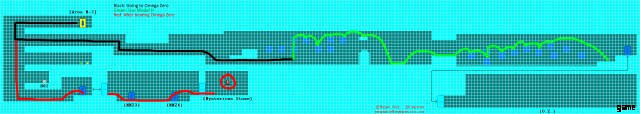 これは、Dr. Cossack's Lab というサイトから入手したエリア N の地図で、彼にたどり着くのに役立つように修正したものです。火の顔の敵を倒し、自分の敵の下の棚に落ちます。その後、別のファイアーフェイスが見えますが、それは低地にあります。それを倒し、正しい道を進んでいる場合、あなたが来るエリアは緑色に見えます. 2 つの消えるブロック パーツを通過する必要があります。最初のものは結果なしで台無しにすることができますが、オメガゼロの部屋につながる2番目のものは、スパイクに落ちても大丈夫でない限り、台無しにすることはできません.彼の部屋に入ったら。ついに戦いが始まる。
