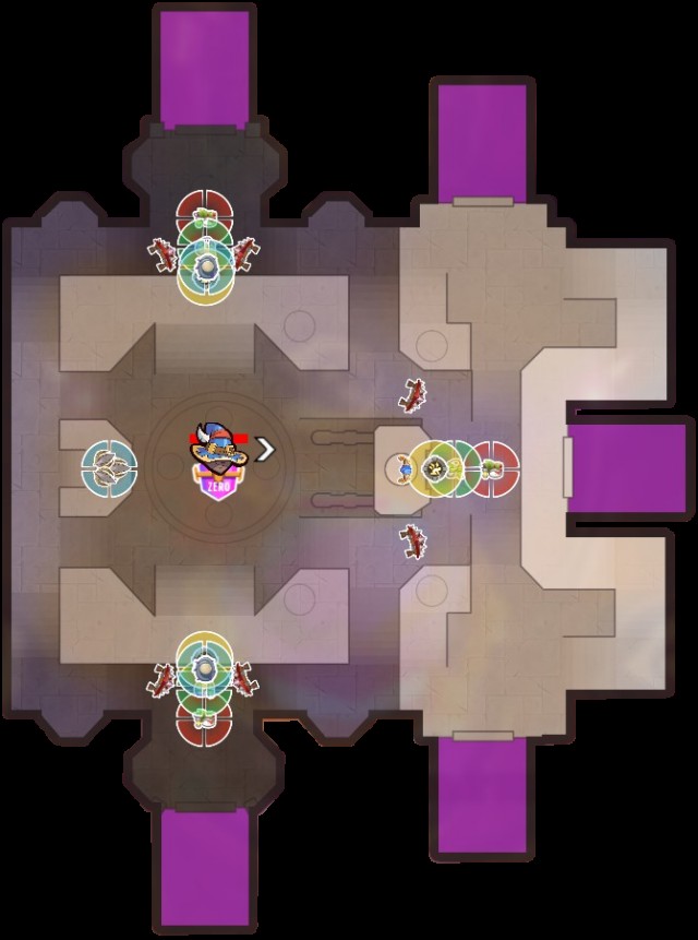 次に、メイジ タワー、3 つのストライカー タレットは、マップの奥、フロアの小さな隆起部分にあるクリスタルの後ろに移動し、タレットが両側の入り口、中央の 2 つのレーン、および中央のみを向いた最終砲塔。