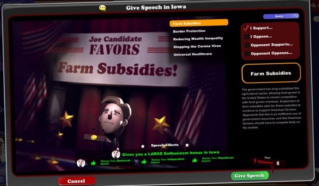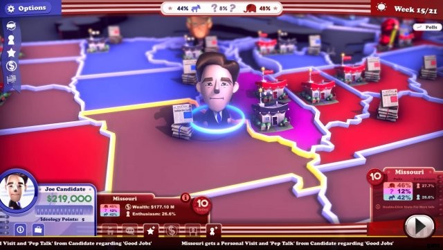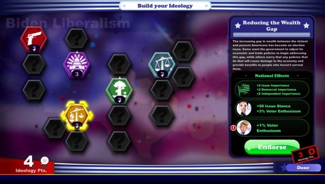 ポイントが貯まると、イデオロギーを購入することができます。選択には多くの微妙な戦略が関係しています。人々が投票に行くようになるので、熱意は素晴らしいものです。しかし、問題に関する他の候補者の立場が気に入ったとしても、必ずしもあなたに投票するとは限りません。
