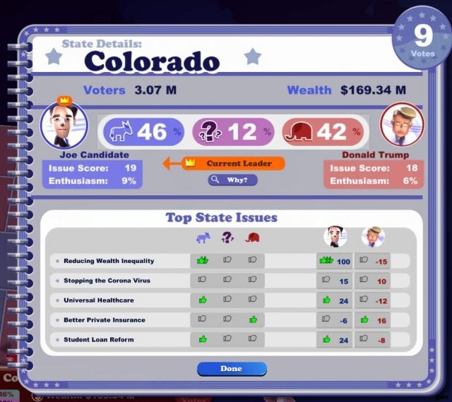 私の戦略は、富の不平等を減らすことを中心に展開する傾向があります。これは、(他の党派の問題と比較して)党派を超えて非常によく世論調査を行うためです。ただし、ほとんどの政治家が具体的になりすぎないのには理由があります。富の不平等との戦いのロックを解除すると、富裕層への課税とユニバーサル ヘルスケアのロックが解除されます。あなたが情熱を感じる問題を選ぶ前に、激戦州のさまざまな問題についての世論調査を注意深く見てください。カリフォルニア州(または共和党員ならテキサス州)に勝つことではありません。激戦州に勝つことです。