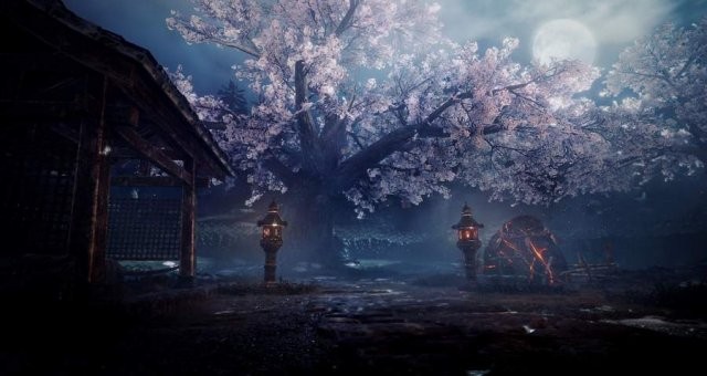 About halfway up, you’ll notice a field of the dark realm, run towards it then walk up to the end of the wooden planks. Jump down onto the surface below and you’ll find the second Kodama. Once you’ve guided the Kodama back to the shrine, jump down the wooden planks below where you’ll come across an axe-wielding soldier. Go inside the corridor then head in the small room that’s on the left, you’ll find a large chest containing random items and gear. Go back to the corridor and go straight until you reach the other exit that’s on the right.