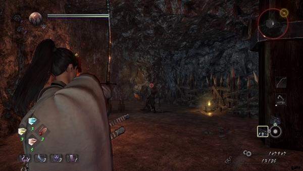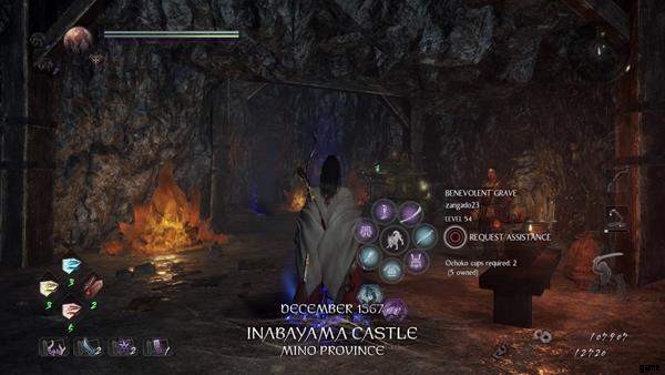 The year is December 1567, and players arrive at an underground passage of Inabayama Castle in Mino Province surrounded by yellow crystals, you can break these crystals to collect Amrita. You’ll see the first Kodama shrine ahead and Tokichiro, speak to him to learn more about your objective. You’ll learn that Tokichiro and Mumyo will search for more Spirit Stones while you infiltrate the castle, he’ll also give you 1x Small Spirit Stone. As you approach the ladder, Hanbei’s guardian spirit will appear as your guide through the shortcut of the castle.