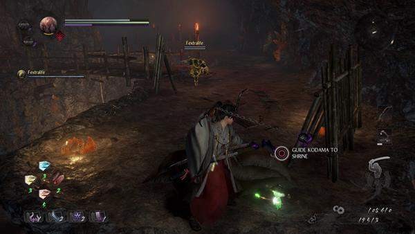 Cross the wooden bridge where another Dweller is standing and check the right side, you’ll find the first Kodama behind some sacks next to some bamboos. After guiding the Kodama, go straight, you’ll find a small chest at the end, just be careful since there is more Dweller yokai. After collecting the items inside the chest, jump down and walk towards the stairs. Before you run up the stairs, there’s a new Yokai that is capable of shapeshifting into a lantern. Ready your bow and shoot the stone lantern that’s lit on the right, you’ll find out that these Yokai were once stone lanterns that have acquired a spirit and became a hostile Yokai. If you shoot it while it’s disguised as a stone lantern, you can stun it and follow up with a grapple attack. Kill it, loot the skeleton that’s on the stairs, continue forward, and climb up the ladder.