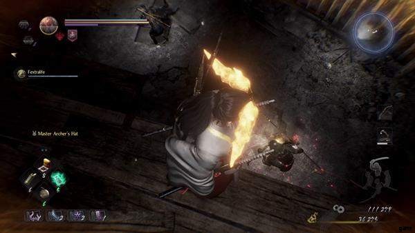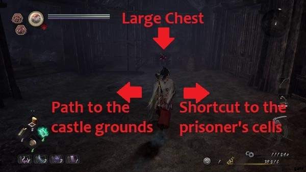 From there, you’ll want to head inside the long corridor of the cells and jump down from the hole that’s on the ground and onto the stone platform. Go straight from the wooden planks, and at the end, go up the slope until you reach the top where you’ll find another large chest and a Koroka yokai. The path ahead will take you to the upper section of the castle grounds.