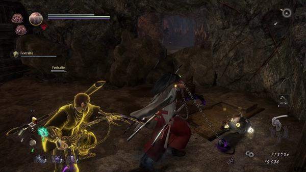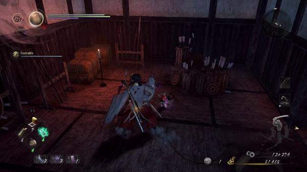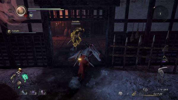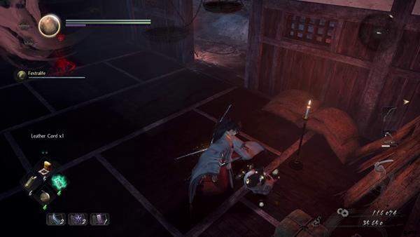 You should reach one level down and a large prison cell that has a mist and a large chest behind it as indicated in the image above. The yokai within the mist is another Koroka, kill it, then open the chest to grab some rare items. After collecting the items, go back outside and jump down the large wooden frames where you’ll see another skeleton that you can loot – jump down, move the crank to call down the lift and ride it until you reach the top.