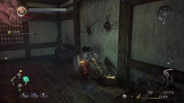 The source of the Dark Realm is a Koroka located in the basement where you’ll also encounter an Enki. Once you dispel the dark realm, you can use the nearby Kodama shrine near the stairs leading to the basement – after that’s done, go back to the second floor where the small armory was and head to the storage room where you’ll find a broken wall that you can run through.