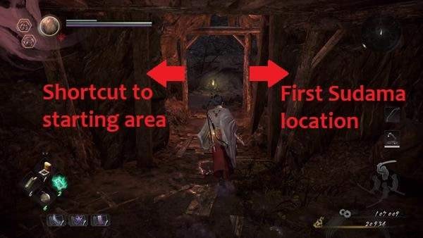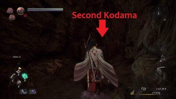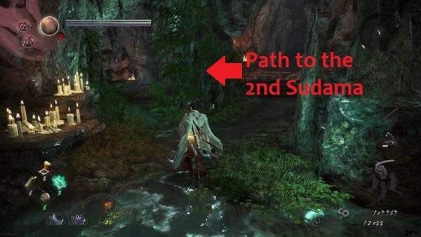 - 最初のスダマは、最初のヤマンバに面した洞窟の外にあります。洞窟から出て、左のドアから出て右に曲がります。スダマは茂みの奥にあります。
