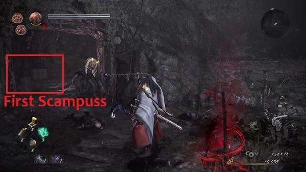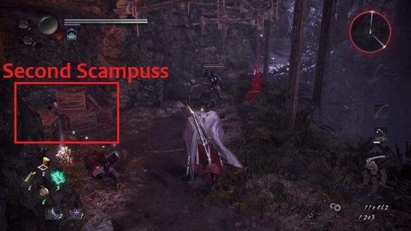 洞窟を出て急な坂道を進むと、右側に小さな部屋があり、そこで2番目の山姥に遭遇します。それを殺してから、いくつかのバスケットの後ろに最初のScampusを見つける行き止まりの部屋に向かいます. Scampus を見つけた後、急な道を上っていきます。道を塞いでいる霧に出くわします。霧の中の妖怪はエンキです。