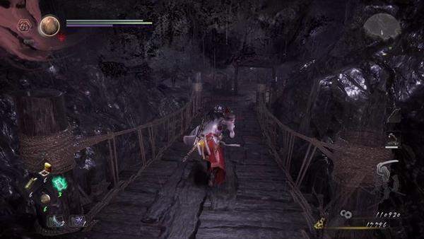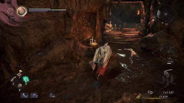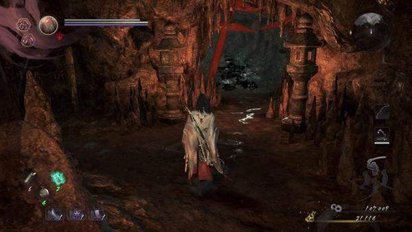 神社から奥に下り坂があります。道をパトロールしている烏天狗の妖怪に出くわします。それを殺してから下って右に曲がると、洞窟への別の入り口と別の山姥が中にあります.山姥を倒したら、ろうそくをたどって洞窟の奥へと進みます。そこには仮設の白い鳥居が見えます。反対側には 2 人の濡れ女とガキがいます。