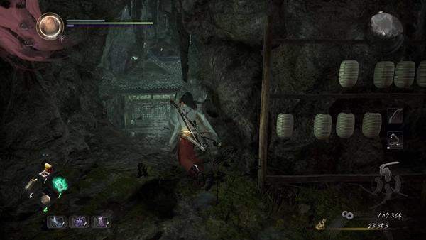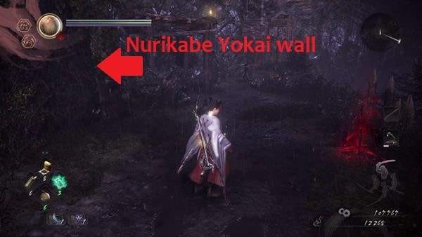 エリアをクリアすると、先の道がダーク レルムに飲み込まれていることがわかります。青鬼、鬼鬼、鬼鬼がいます。小さな妖怪に対処する最善の方法は、表ではなく裏側から闇の領域に向かうことです.濡れ女と戦った場所から、足跡をたどり、右側にある開口部に向かいます。アイテムを取得するために攻撃できる井戸が表示されるエリアの裏側にドロップダウンします.