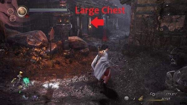 村の下層階に到達すると、家が 2 つ見つかります。左側にあるものには、ランダムなアイテムと1x Ninja's Locksを見つけることができる大きなチェストが含まれています.右側にあるものには、略奪できる死体があります.両方の家を捜索したら、まっすぐ進み、橋を渡って、2 つ目の児玉神社に戻ります。あなたがやりたいことは、温泉があった場所に戻り、神社のある洞窟の中に戻ることです.