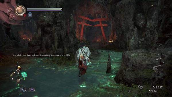 次に戻って、赤い壊れた鳥居をとりあえず無視して、左側にある道を出ます。出てきた道は第二児玉神社に戻ります。今川一族の部隊に遭遇します。最初にそれらを殺すと、上の画像に示されているように、左側にある壁として偽装された妖怪であるNurikabeが見つかります. 「ホイッスル」ジェスチャーを使用して、攻撃を回避してください。妖怪の後ろには、一時的な HP 回復効果を得るために使用できる温泉があります。温泉を利用した後、さらに進んで頂上に向かうと、第 2 児玉神社に戻ります。ダーク レルム。