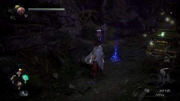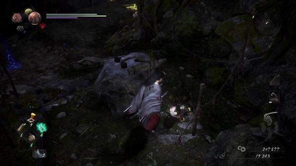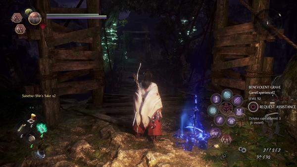 Ahead of the wooden gate, you’ll see two Gaki that’s eating a corpse. Kill it both, loot the body to obtain another memory and some items, and continue forward where you’ll find Mumyo. Speak to her and she’ll give you x1 Clay Bell of Beckoning – at the path below, you’ll find the third Kodama shrine and a small tombstone containing another memory and x1 Inspiritng Gem.