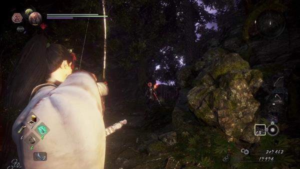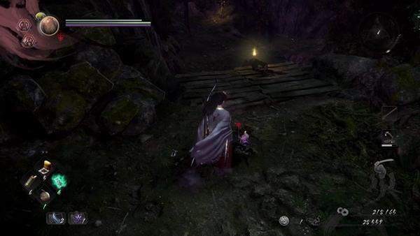 森の奥へと進んでいくと、ガキが守っている長い木の橋に出くわします。橋を渡る前に、必ず橋の横にある死体を略奪してください。反対側には見回り中のミツメヤズラの妖怪がいて、やがて橋の上を歩いていきます。それを殺すことに集中できるように、橋から離れて自分の方に引き寄せるようにしてください。死んだ後、橋に戻り、反対側に到達する直前に弓を準備し、前方の崖に向かって目指すと、戦士の骸骨が弓を振り回しているのが見えます-先に進む前に、体があります橋の反対側近くの右側に光るキノコがある木の隣で略奪することができます.