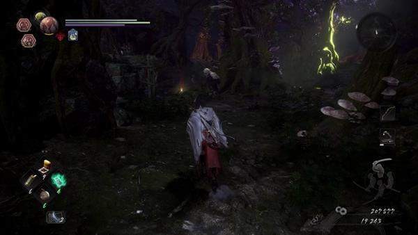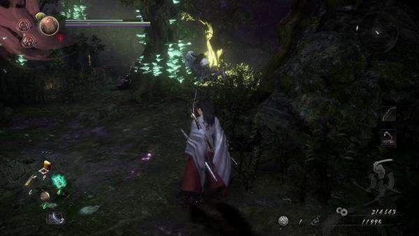 Scampusを見つけたら、中央に別の大きな木が見えるところまで進みます.動くスポットライトや木の周りを回るヤマンバの妖怪も見え、木の右上を見上げるとフクロウのような大きな妖怪から光が差し込んでいるのがわかります。スポットライトの下で捕まらないように、木の後ろの左側でヤマンバと戦うことができます.ガキの前とスケルトンウォリアーもあります. – 光に捕まらないように注意してください。フクロウを撃ってみてください。そうしないと、近くにいる妖怪に警告する信号が送信され、暗黒の領域が出現します。