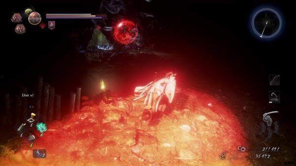 このエリアにはミツメヤズラが回遊しているので、撃って注意を引き、スポットライトから遠ざけるようにしましょう。そうすれば、光に捕まる心配をせずに戦うことができます。ミツメヤズラを除いて、このエリアの他の妖怪は、ヤマンバ、片目のインプ、ガキ 4 体、ウォリアー スケルトン 2 体です。エリアの右端にあるソースであるレッド オーブ – レッド オーブを無効にした場合は、続行する前にエリアで戦利品を確認してください。