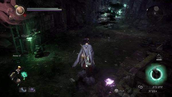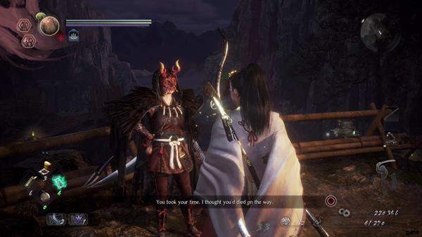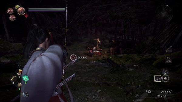 ミッションを開始すると、最初に映画が始まります。時は1570年4月、プレイヤーが越前国の金ヶ崎に到着すると、スタート地点の先に最初の児玉神社があります。神殿の近くに立っている謎の男に 2 回話しかけて、目的の詳細を確認し、セイクリッド アローを入手します。森に向かって丘を上ると、壊れた家々の周りを歩き回る装甲犬に遭遇します。