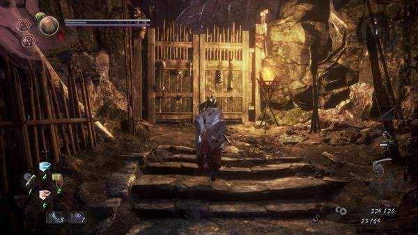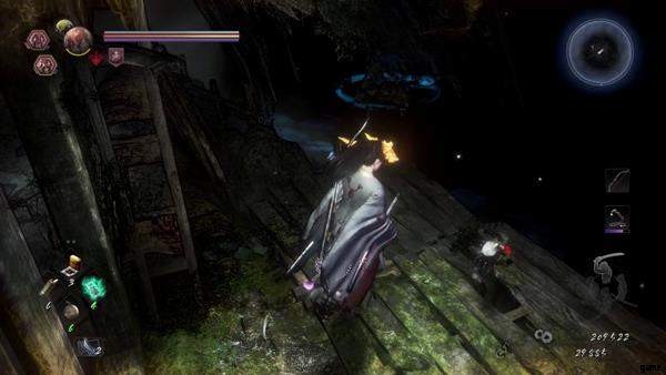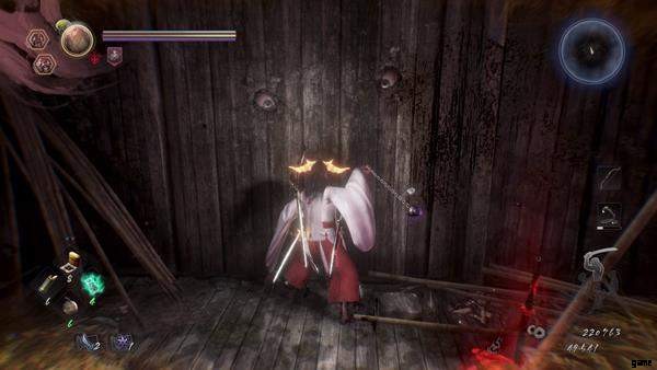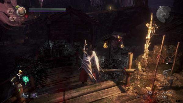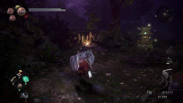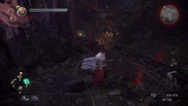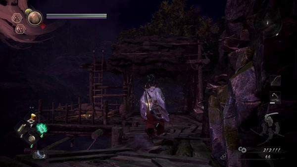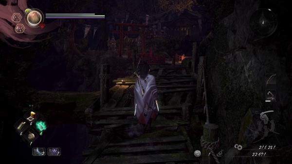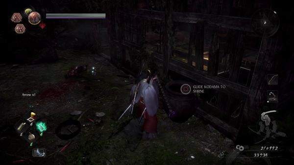 神社から木の板に向かって進み、左側にあるはしごを登ります。屋根の上にいるガキが上から待ち伏せしているのを見つけることができます。グラップル攻撃を使用して奇襲で倒すことができます。次に、ジャンプして戻って、右側にある家の別の屋根まで歩いてください。屋根の上に別の戦士の骸骨が立っています。屋根には飛び込める穴があり、家の中のヤマンバを驚かせることができます。開くことができる小さなチェストもあります。家の中を片付けたら、外に出て真ん中にある木まで歩いていきます。武器を一時的に浄化する、破壊できる輝くポットがあります。木の右側に行くと、片目のインプが茂みから飛び出して攻撃してきます。できるだけ早く倒してください。それが完全に成長した片目の鬼に変身する前に、あなたができるように.