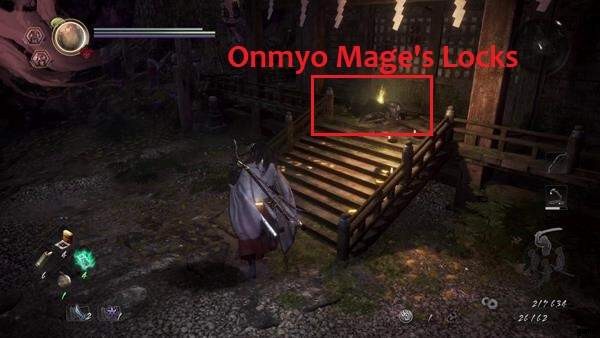 - 陰陽魔道士の錠前は、寺院の閉ざされた扉のそばにいる死体から略奪することができます。動くスポットライトが当たる 2 番目のエリアに、寺院に通じる小道があります。