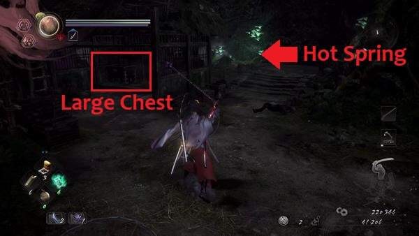 Before you continue forward, you’ll want to go back to where the One-eyed Imp was and head to the lower area where you’ll see a One-eyed Oni. Kill it and just past it, you’ll find a shack that has a large chest inside. Behind the shack, you’ll also find the hot spring for this mission – after that’s done, go back to the area where you fought the Mitsume Yazura yokai.