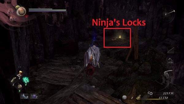 - 忍者の錠前は、第三児玉神社近くの村の高い崖の上にあります。屋根を通り抜け、道の終わりにあるはしごを登る必要があります。上部に、アイテムを持っている死体があります。
