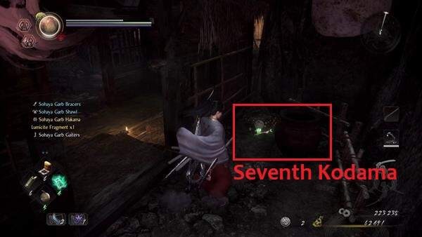 The main objective of the mission is just ahead of the village where you’ll face the boss of this mission. But before you head inside, you’ll want to search and clear out the village first for loot. Near the gate leading to the boss, there’s a bouse on the right where you’ll find a Yamanba in it, kill the yokai and check the house where you’ll find a large chest. In the same house, go out the back and you’ll find the seventh Kodama behind some large pots.