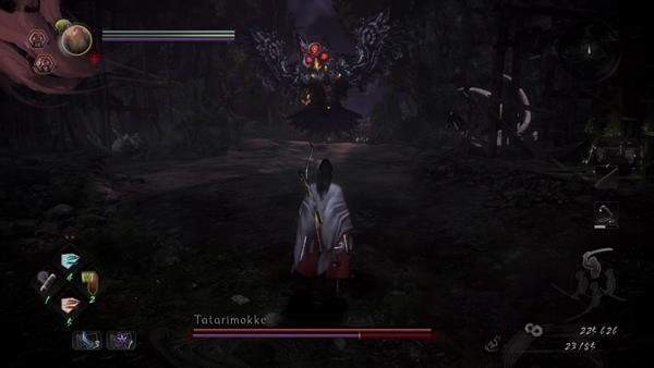 Here, you’ll face the Tatarimokke. It’s the one responsible for giving you a hard time maneuvering around the forest and avoiding the spotlights. You’ll want to have an NPC companion assist you for this battle or team up with your friends. The Tatarimokke has quite a long-range when it swings its wings forward, it will also fly around the area and shoot those dark orbs at you as well as its feathers. It has a burst attack that you can easily counter where it flies up into the air before diving towards your location. Sometimes if it misses you when it does its burst attack, its head will turn around and it will shoot a laser beam from its middle eye. So try to counter its burst attack.