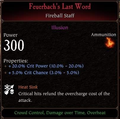 このビルドが機能するには、ヒートシンクが必須です。クリティカル チャンスとクリティカル パワーにより、素晴らしいダメージ ボーナスが得られます。ヒートシンクにより、プレイヤーは過充電を心配することなく火の玉スタッフをスパムすることができます。このビルドは非常に高いクリティカル チャンス (最大オーバーチャージと機器のプロパティに基づいて 30-50% のクリティカル チャンス) を使用するため、ヒート シンクを使用すると、もちろんオーバーチャージ以外に、プレイヤーは無制限に火の玉を連発できます。オーバーチャージが増えると、パイロマンサーのクリティカル チャンスが増加するため、プレイヤーがオーバーチャージに達して死ぬまでに約 20 ~ 30 個のファイアボールが必要です。