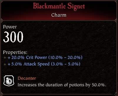 チャームはDPSを強化する上で非常に重要です。最大20%のクリティカルパワーを提供する可能性があるため。攻撃速度も良いですが、必須ではありません。デキャンタはこのビルドで素晴らしいです。ストレングス ポーションまたはスピード ポーションを使用して火の玉を連打し、集中ポーションを使用して F アビリティを連打することができます。したがって、このビルドにはすべてのポーションを使用できます。