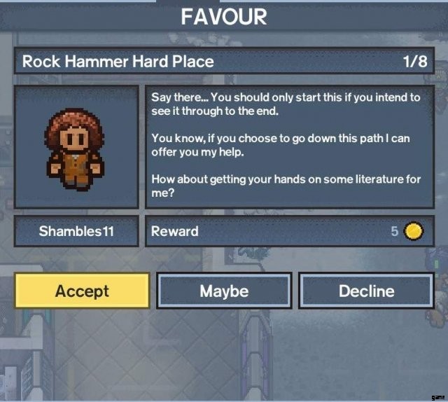 最初の好意には、本を取得することが含まれます。この本は常に受刑者のデスクの 1 つでスポーンするので、いつでも簡単に取得できます。