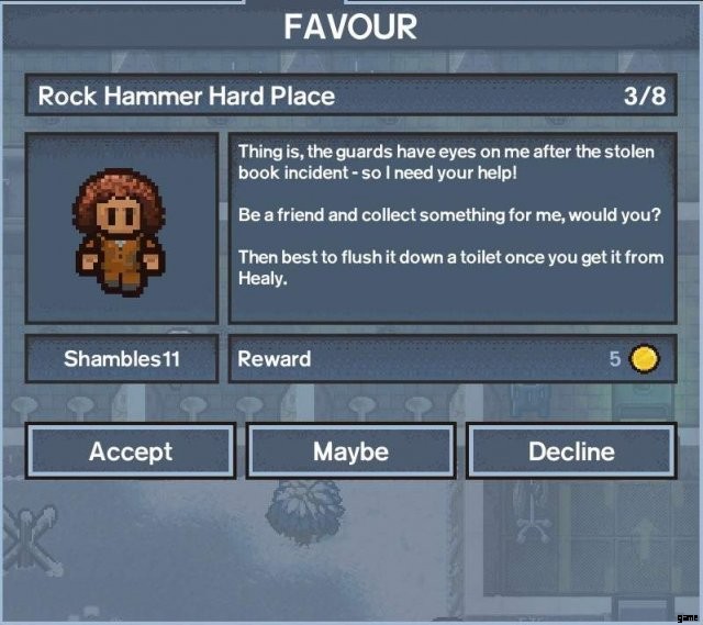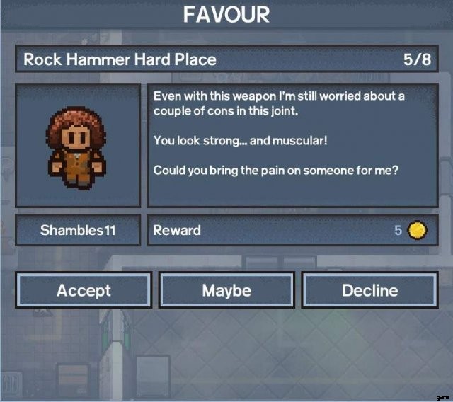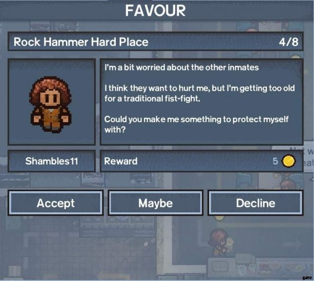 それは常に同じ囚人によって提供されるので、以前に囚人に会ったことがある場合は、彼に近づくことができ、たとえあなたがそれを断ったとしても、好意は常にそこにあります.