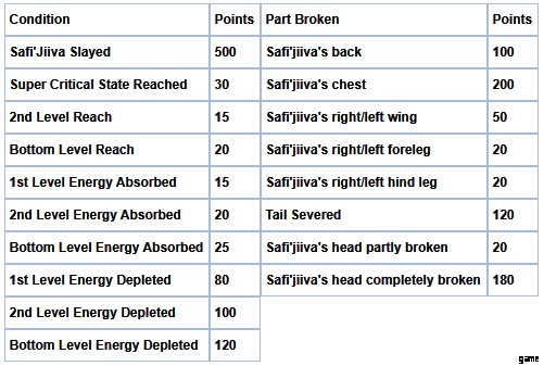 - 採集ハブに戻って 2 回目のクエストを受けるときは、今度はできるだけ多くのパーツを壊してサフィ・ジーヴァを倒すことを目指します。 2 回目の実行では、Safi'Jiiva が下のレベルに進むまでに 3 分以上かかることはありません。 (エネルギーゲージがゼロの場合、1 分未満の可能性があります)。したがって、最下層でサフィ・ジーヴァを倒すための時間が増えます!