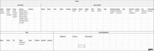 山を越えた極東地域の牧畜動物がたくさん。皮、牛、羊、肉に非常に適しています。塩分が必要な地域もあります。他の人はオリーブとワインが本当に好きです。南東部では鉄鉱石がかなり豊富にあり、道具はかなり安いようです。ステッペ ホースは、利用可能なマウントがほとんどない土地でまともな価格を設定できる場合があります (Cough* Battanians)。リネンと陶器のいくつかの良い情報源。銀鉱石と革を要求することがあります。ほとんどの場合、スタイリッシュなコート用にいくらかの毛皮が必要です.